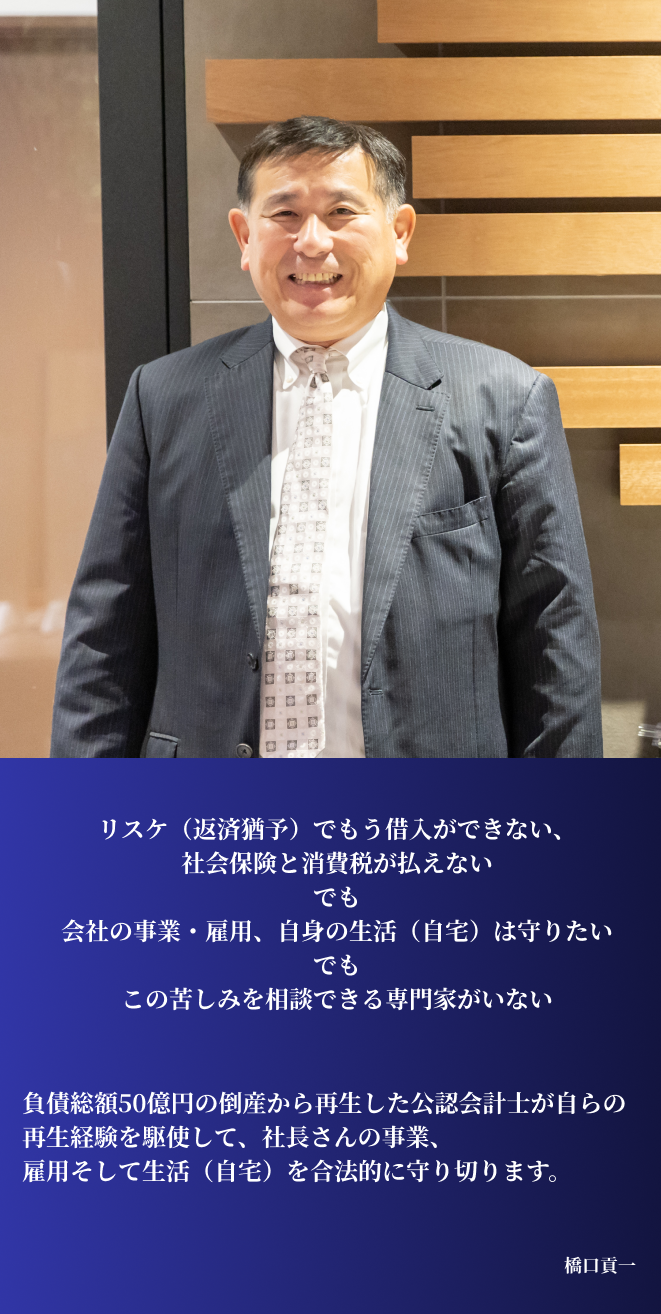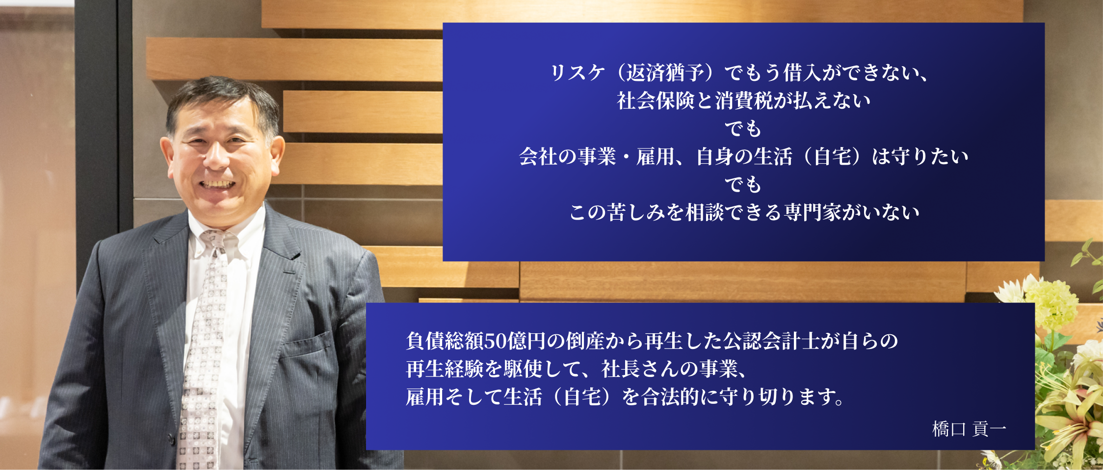 弊社(私)は、倒産を経験した経営者および公認会計士として経営危機に陥った依頼先の事業、雇用そして社長様の生活(自宅)を合法的に守り切る再生支援ビジネスを展開しております。 会社の経営がどんなに厳しい状況でも、現行の倒産法制(破産法・民事再生法・会社法・民法等)においては、合法的に会社の事業を第二会社方式により再生(第二会社再生)させ、経営者の連帯保証債務を免責しつつ、経営者の生活(自宅)を守れる法理論がヤマほどあることを私は自らの再生経験を通じて知るに至りました。